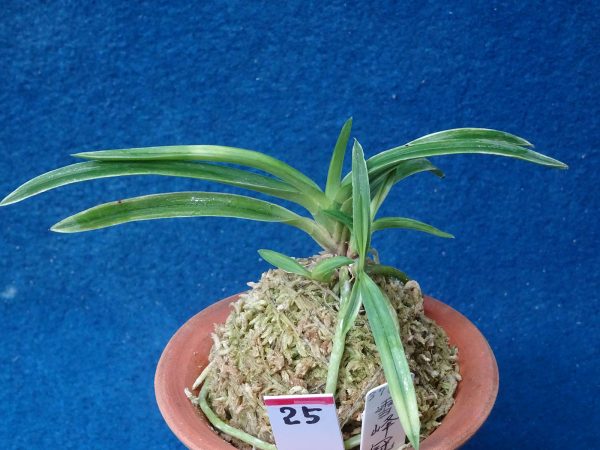 細葉で湾曲した親木に中子1、小子2。天葉は白虎状に伸び上がり、後に白細覆輪を伴い伸びる。全葉に柄性あり。